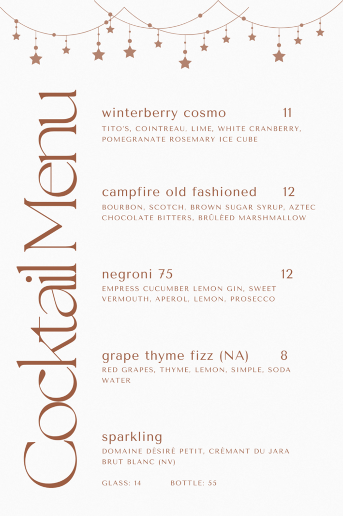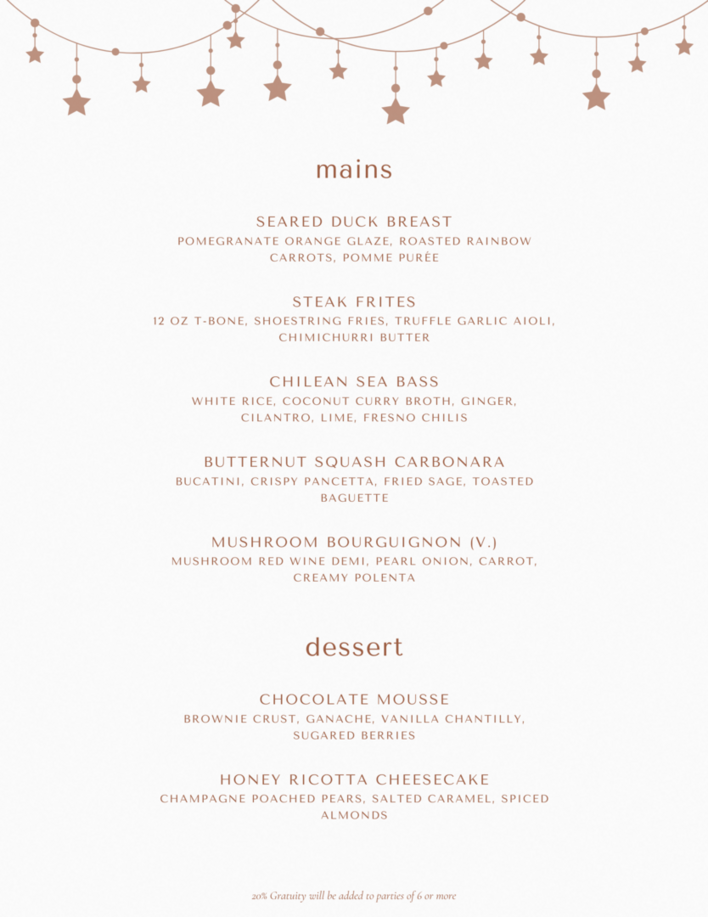 Each guest will choose an Appetizer, Soup or Salad, Entree, and Dessert course.